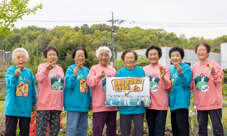 ▲ 할매들 영상 보고 치킨 먹자!’수니와칠공주가 통영 바다를 배경으로 촬영된 해양관광 캠페인 영상의 댓글 이벤트를 알리며 밝게 웃고 있다.” |