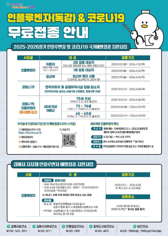 시는 9월 22일부터 ‘2025~2026절기 인플루엔자 국가예방접종’을 시행 중이며접종 대상은 생후 6개월~13세 어린이(2012.1.1.~2025.8.31. 출생자), 임신부, 65세 이상 어르신(1960.12.31.이전 출생자)이다.
