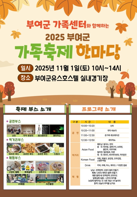 [무한뉴스=정민정 기자] 부여군 가족센터는 오는 11월 1일 오전 10시부터 오후 2시까지 부여군유스호스텔 실내경기장에서‘2025년 부여군 가족축제 한마당’을 개최한다고 밝혔다.