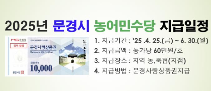 [무한뉴스=최진수 기자] 문경시는 오는 4월 25일부터 6월 30일까지 2025년 문경시 농어민수당을 지역 농·축협(지점)을 통해 문경사랑상품권으로 지급한다고 밝혔다.