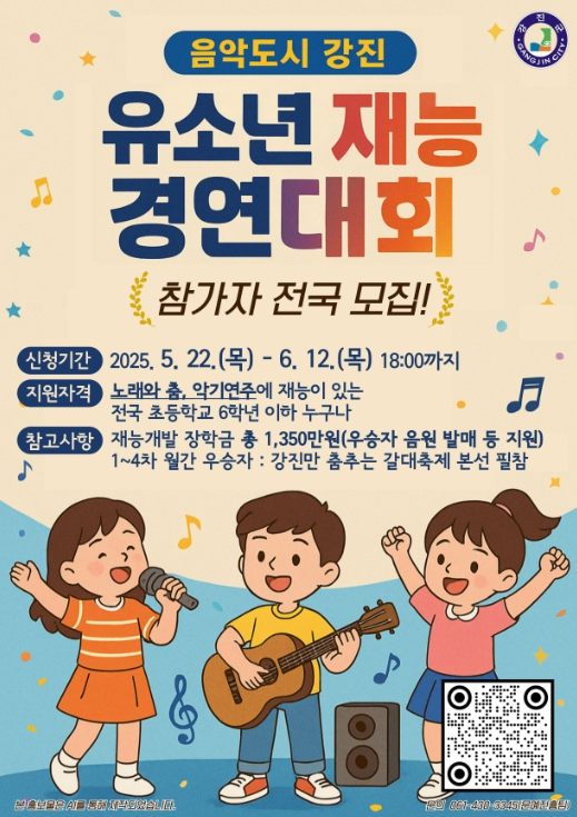 [무한뉴스=정민정 기자] 강진군이 노래, 춤, 연주 분야에 재능을 가진 유소년을 발굴하고 미래 창의 인력 성장 지원의 기틀을 마련하기 위해 총 1,350만원의 재능개발 장학금이 수여되는 2025 음악도시 강진 유소년 재능 경연대회를 오는 6월 넷째 주 토요일부터 추진한다.