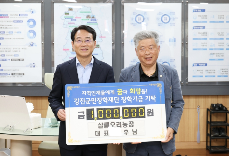 지난 21일 강진군 오리협회 홍종고 회장과 함께 배후남 회원이 200만 원, 땅심화훼영농조합법인 천만일 대표가 200만 원을 강진군민장학재단에 기탁했다.