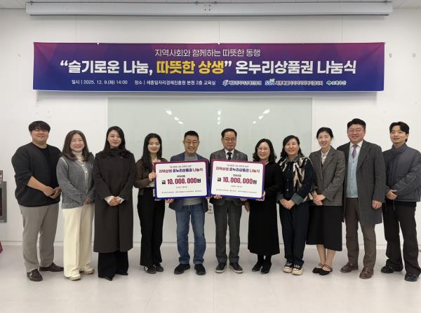 [무한뉴스=정민정 기자] 세종일자리경제진흥원은 9일 진흥원 본원 2층에서 세종특별자치시사회복지협의회, 초록우산 세종지역본부와 함께 ‘슬기로운 나눔, 따뜻한 상생’ 온누리상품권 나눔식을 가졌다.