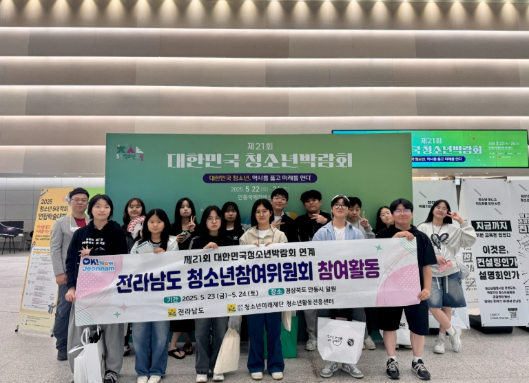 [무한뉴스=정민정 기자] (재)전라남도청소년미래재단은 전라남도 청소년참여위원 16명이 5월 23일부터 24일까지 1박 2일 일정으로 경상북도 안동시에서 열린 ‘제21회 대한민국청소년박람회’에 참가해 다양한 청소년 활동을 체험하고 지역문화 탐방을 진행했다고 밝혔다.