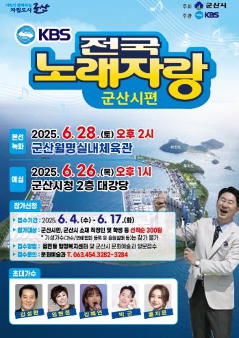 [무한뉴스=정민정 기자] 군산시는 KBS 최장수 프로그램인 전국노래자랑이 6월 28일 토요일 오후 2시부터 군산시 월명실내체육관에서 공개녹화를 진행한다고 밝혔다.