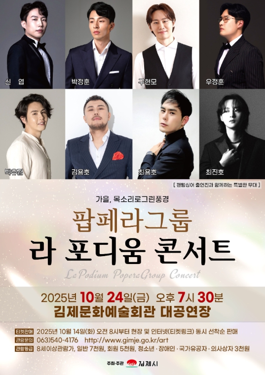 [무한뉴스=정민정 기자] 깊어 가는 가을, 특별한 음악의 향연 팝페라 그룹'라 포디움 콘서트'가 오는 24일 오후 7시 30분 김제문화예술회관 대공연장에서 펼쳐진다.