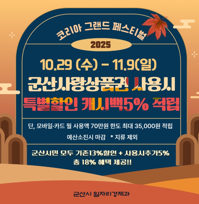 [무한뉴스=정민정 기자] 군산시가 오는 29일부터 11월 9일까지 12일간 정부가 추진하는 ‘코리아 그랜드 페스티벌’에 참여해 군산사랑상품권 이용자에게 파격적인 추가 혜택을 제공한다.
