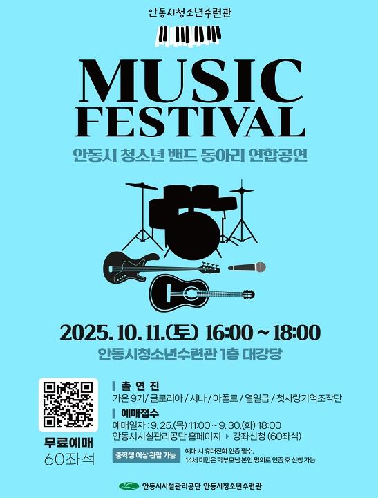 [무한뉴스=최진수 기자] 안동시시설관리공단에서 운영하는 안동시청소년수련관이 '2025 안동시 청소년 밴드 동아리 연합공연 ‘뮤직 페스티벌’'을 오는 10월 11일 청소년수련관 대강당에서 개최한다고 밝혔다.