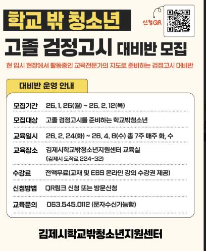[무한뉴스=정민정 기자] 김제시는 학교밖청소년지원센터(꿈드림)가 학교 밖 청소년의 학력 취득을 지원하기 위해 2026년 고졸 검정고시 대비반을 운영한다고 밝혔다.