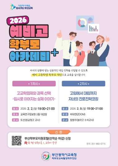 이번 아카데미는 2026학년도 예비 초·중·고 학부모를 대상으로 다음달 2일부터 11일까지 부산진구 양정동 교육연구정보원에서 학교급별 2차시씩 총 6회 과정으로 운영한다. 온라인 비대면 방식도 혼합 운영하여 학부모의 참여 접근성을 높였다.