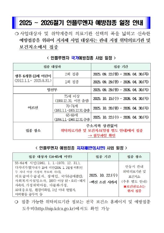 권기창 안동시장은 “안동시민의 건강을 지키는 인플루엔자 무료 예방접종에 많은 시민이 참여해, 건강한 안동 만들기에 동참해 주시길 바란다”고 전했다.