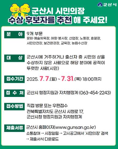 접수는 후보자의 추천서, 공적조서, 공적 증명서류 등을 갖춰 7월 31일까지 군산시청 행정지원과를 방문하거나 우편으로 제출해야 한다.