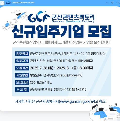 자세한 사항은 군산콘텐츠팩토리 운영지원실로 문의하면 된다.
