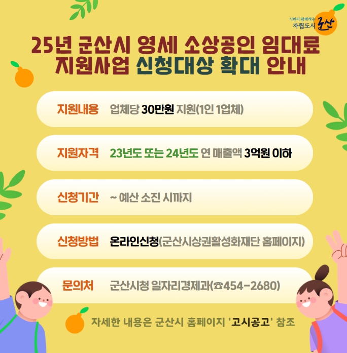 더 자세한 사항은 군산시청 누리집 고시·공고란을 참고하거나 군산시 일자리경제과로 문의하면 된다.