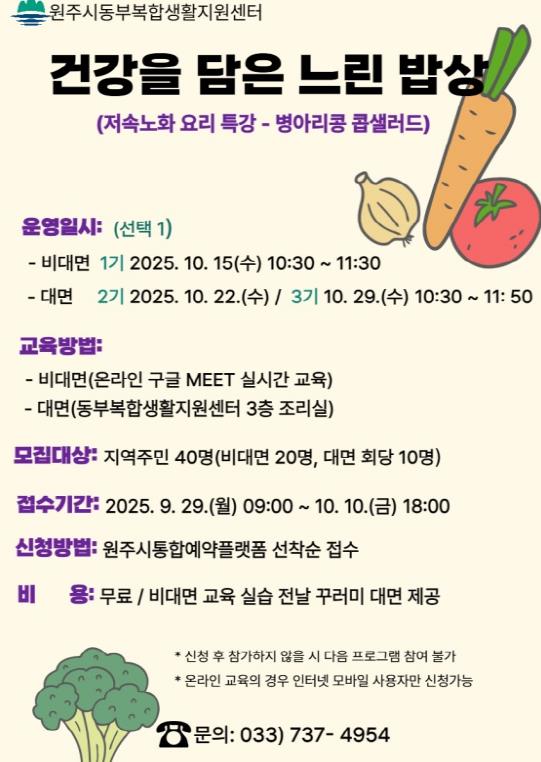[무한뉴스=정민정 기자] 원주시동부복합생활지원센터는 오는 29일부터 저속노화 요리 특강 ‘건강을 담은 느린 밥상’ 프로그램 참여자를 모집한다.