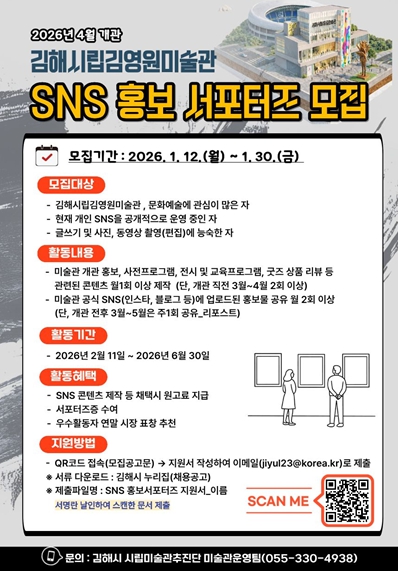 [무한뉴스=최진수 기자] 김해시는 오는 2026년 4월 개관 예정인 ‘김해시립김영원미술관’을 알리고, 미술관의 개관 과정을 생생하게 기록하고 홍보할 'SNS 홍보 서포터즈'를 모집한다고 밝혔다.