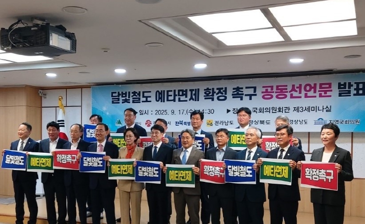 [무한뉴스=최진수 기자] 영․호남 6개 시․도지사와 달빛철도 경유지역 국회의원들이 17일 국회에서 ‘달빛철도 예비타당성조사 면제 확정을 촉구하는 공동선언’을 발표했다.