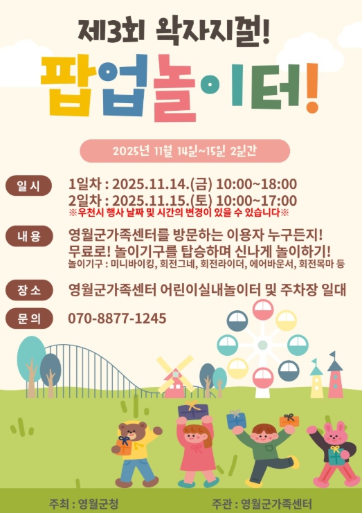 [무한뉴스=정민정 기자] 영월군 가족센터는 오는 11월 14, 15일 ‘제3회 왁자지껄 팝업놀이터’를 운영한다.