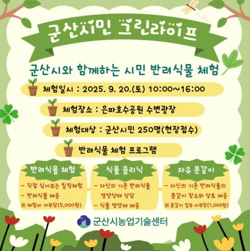 [무한뉴스=정민정 기자] 군산시는 20일 오전 10시부터 오후 4시까지 은파호수공원 수변무대 앞 공원에서 '군산시민 그린라이프, 반려식물 체험행사'를 개최한다고 밝혔다.