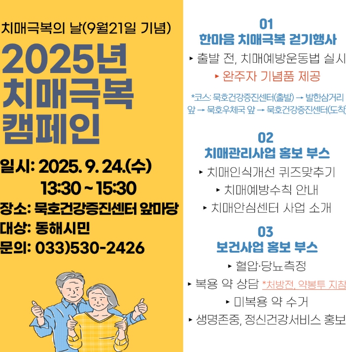 [무한뉴스=정민정 기자] 동해시는 2025년 치매극복의 날(9월 21일)을 맞아 치매에 대한 인식개선과 예방·관리의 중요성을 널리 알리기 위해 오는 9월 24일 오후 1시 30분 묵호건강증진센터 앞마당에서 기념 캠페인을 개최한다.