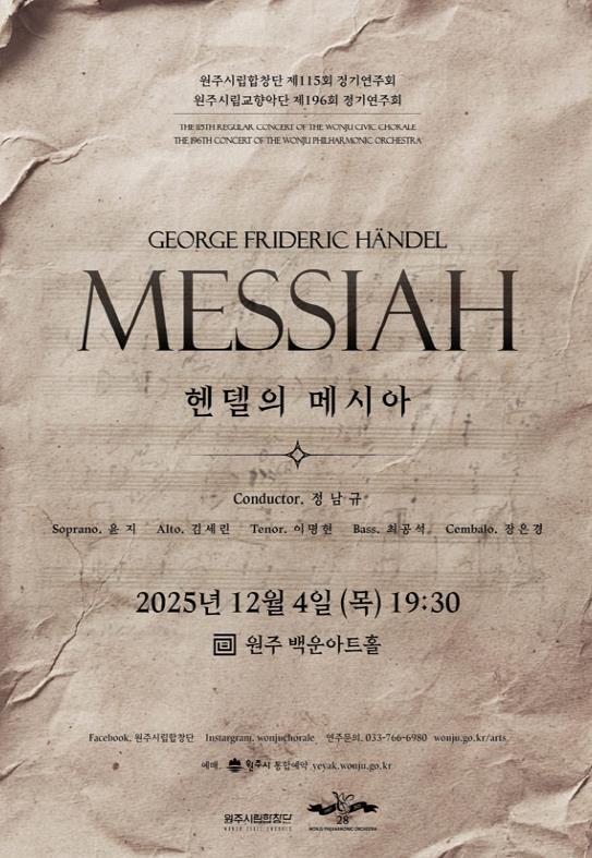 [무한뉴스=정민정 기자] 원주 시립합창단과 시립교향악단은 오는 12월 4일 오후 7시 30분 백운아트홀에서 정기연주회 ‘헨델의 메시아’를 개최한다.