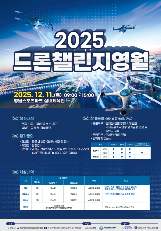 [무한뉴스=정민정 기자] 영월군은 관내 여러 기관과 협력해 12월 11일 목요일 오전 9시부터 오후 3시까지 영월스포츠파크 실내체육관에서 ‘2025 드론 챌린지 영월’을 개최한다고 밝혔다.