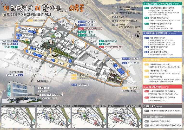 우천면 쇠목골 마을은 1993년 계획적으로 조성돼 도로와 가로망은 비교적 양호한 편이나, 건축물의 상당수가 30년 이상 경과하며 노후화가 심각한 상황이다.