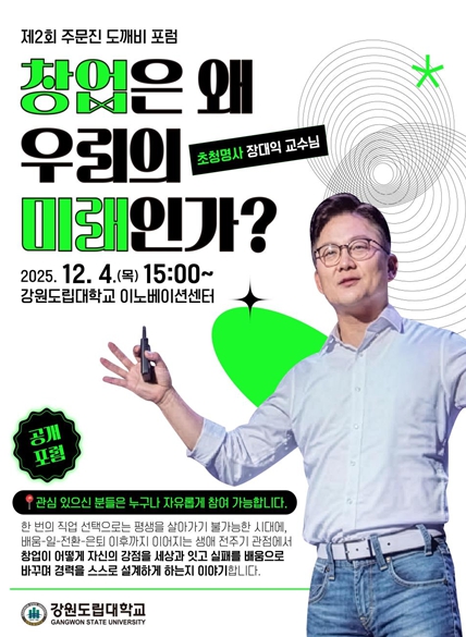 [무한뉴스=정민정 기자] 강원도립대학교는 지역주민과 학생을 위한 개방형 지식 교류 프로그램인 '주문진 도깨비포럼: 우리 시대의 명사가 전하는 말'의 두 번째 행사를 오는 12월 4일 오후 3시 강원도립대학교 이노베이션센터에서 개최한다.