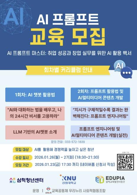 교육은 총 2회차로 구성되며, 1월 26일과 27일 양일간 오후 6시 30분부터 9시까지 삼척청년센터에서 진행된다. 1일차에는 ‘AI 챗봇 활용법’을 주제로 일상과 업무 적용 방법을 다루고, 2일차에는 프롬프트 엔지니어링 기법을 활용한 AI 멀티미디어 콘텐츠 개발 실습이 이어진다.