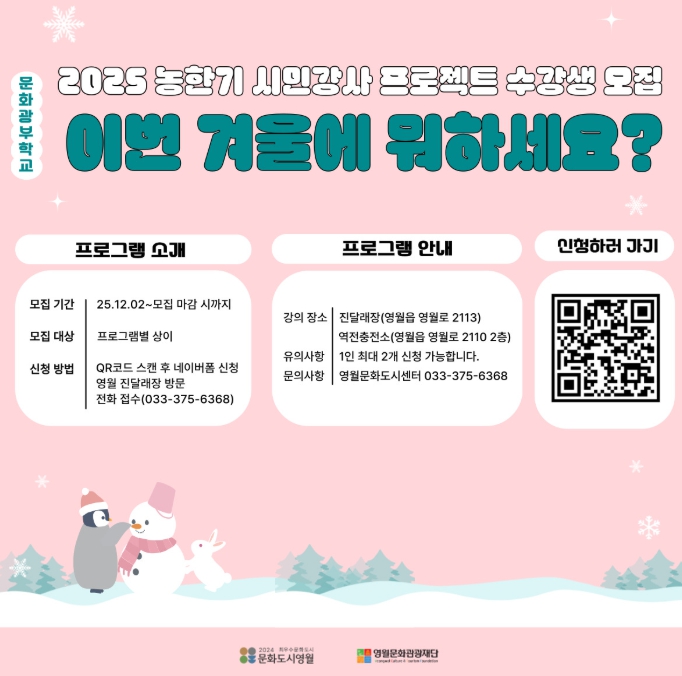 [무한뉴스=정민정 기자] (재)영월문화관광재단은 2025 문화 광부학교 농한기 시민 강사 프로젝트 수강생을 12월 2일부터 모집한다고 밝혔다.