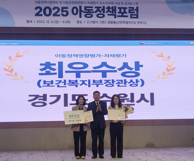 [무한뉴스=양현명 기자] 수원특례시가 보건복지부·아동권리보장원이 주관하는 ‘2025년 아동정책영향평가’에서 우수 지자체로 선정돼 보건복지부장관상을 받았다. 시상식은 8일 원주시 오크밸리리조트에서 열린 ‘제13회 아동정책포럼’ 중 진행됐다.