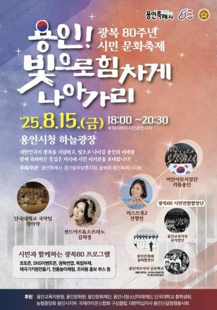이 행사는 광복 80주년의 역사적 의미를 되새기고 용인의 밝은 미래를 기원하기 위한 희망의 메시지를 담은 시민 문화축제로 기획했다.