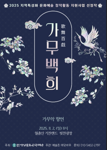 [무한뉴스=정민정 기자] 영암의 가을들녘에 가무악의 정수를 더한다. (재)영암문화관광재단은 ‘2025 지역특성화 문화예술 창작활동지원’사업의 일환으로, 지역 예술단체인 ‘예술촌 마당바우’(대표: 문치빈)과 함께 오는 11월 2일 일요일 오전 11시, 월출산 기찬랜드 빛찬광장에서 전통무용 공연을 개최한다.