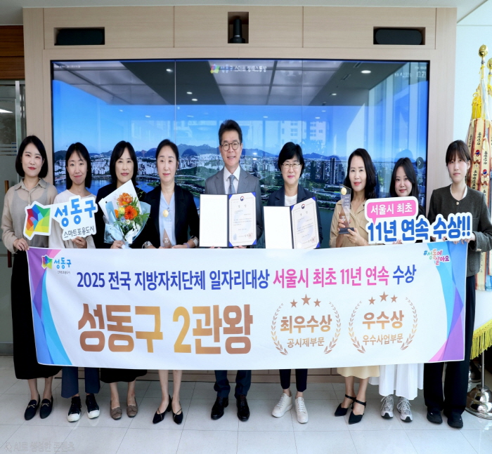 [무한뉴스=정승훈 기자] 서울 성동구가 ‘2025년 전국 지방자치단체 일자리대상’에서 공시제 부문 ‘최우수상’과 우수사업 부문 ‘우수상’을 수상하며 2관왕 달성과 동시에 2015년부터 11년 연속 수상이라는 대기록을 세웠다고 밝혔다.