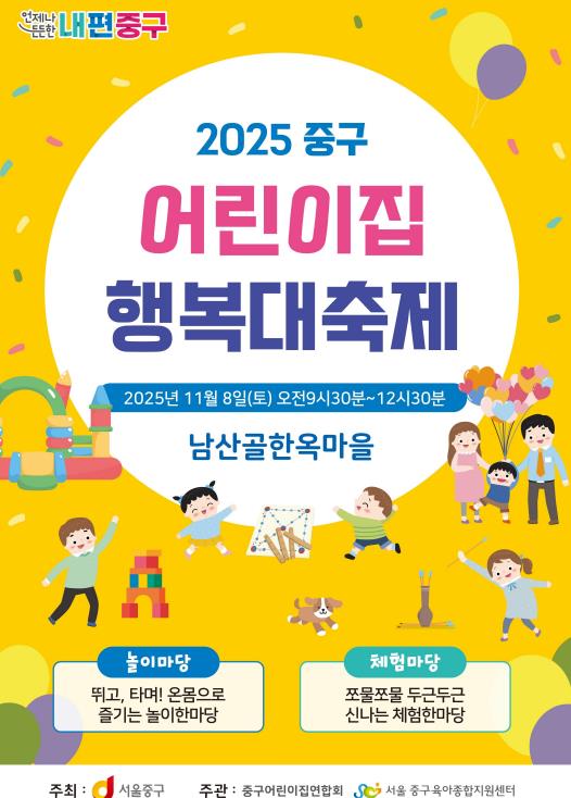 [무한뉴스=정승훈 기자] 서울 중구는 오는 11월 8일 토요일 오전 9시 30분부터 12시 30분까지 남산골 한옥마을 천우각 광장 일대에서 '2025 중구어린이집 행복대축제'가 개최된다고 밝혔다.