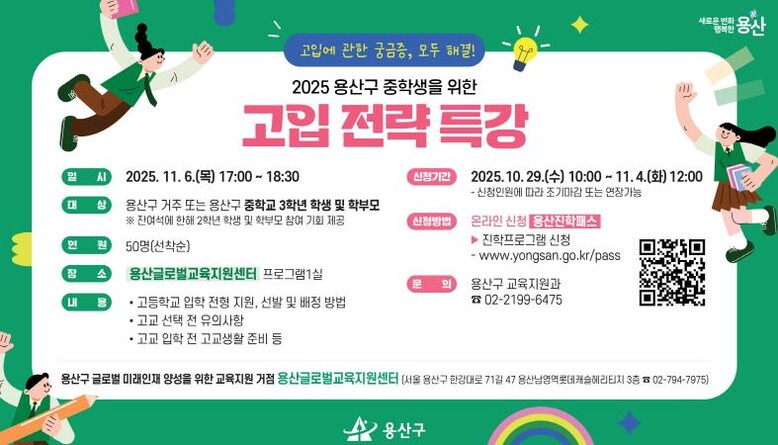 ‘중학생을 위한 고입 전략 특강’은 내달 6일 오후 5시 용산글로벌교육지원센터(한강대로71길 47, 3층)에서 열린다. 참가 대상은 용산구에 거주하거나 지역 내 학교에 재학 중인 중학교 3학년 학생과 학부모 50명이다.