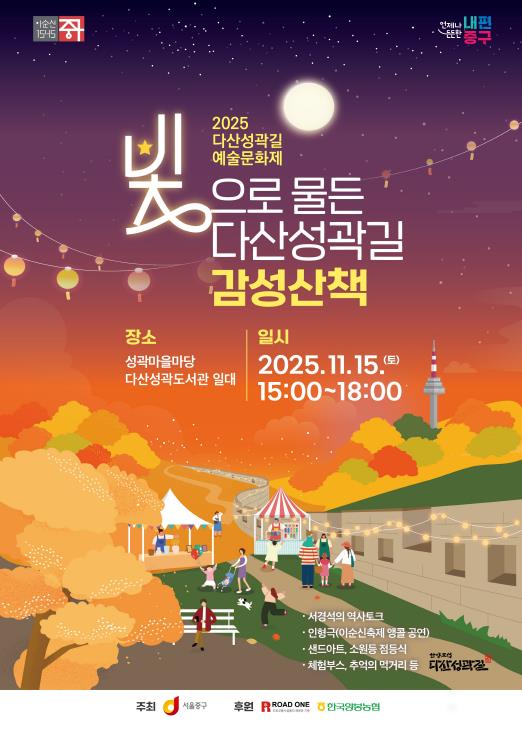 [무한뉴스=정승훈 기자] 서울 중구는 오는 15일 오후 3시부터 6시까지 다산성곽도서관과 성곽마을마당 일대에서‘2025 다산성곽길 예술문화제’를 개최한다. 중구 역사홍보대사 방송인 서경석 씨의 역사특강부터 청춘인형극단의 인형극, 소망등 점등식, 미리보는 성곽길 감성가로 샌드아트 등 다채로운 프로그램이 가득하다.