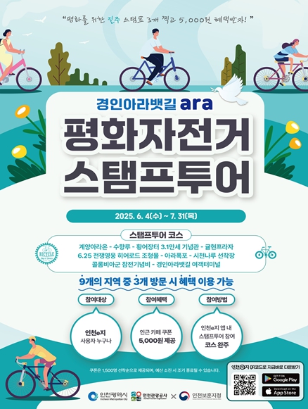 [무한뉴스=정승훈 기자] 인천광역시와 인천관광공사는 6월 호국보훈의 달을 맞아 6월 4일부터 7월 31일까지‘인천 평화 자전거 스탬프투어’를 운영한다고 밝혔다.