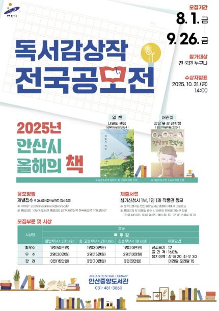 이번 독서 감상작 전국 공모전은 ‘2025년 안산시 올해의 책’ 사업과 연계한 사업으로, 시민들의 독서 문화 환경을 독려하고자 마련됐다.