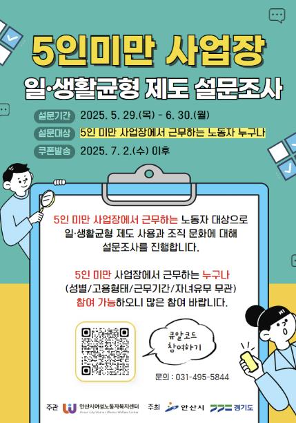 [무한뉴스=정승훈 기자] 안산시는 안산시여성노동자복지센터에서 5인 미만 사업장에 근무하는 노동자의 일·생활 균형 제도 사용 실태와 조직 문화 파악을 위한 온라인 설문조사를 진행한다고 5일 밝혔다.