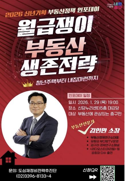 [무한뉴스=정승훈 기자] 서울 중구가 급변하는 부동산 환경 속에서 주민들의 현실적인 대응 전략을 돕기 위해 오는 29일 저녁 7시 신당누리센터 5층 대강당에서 올해 첫 도시런(learn) 스쿨‘신년기획 부동산 전략 인포(INFO)데이’를 연다.