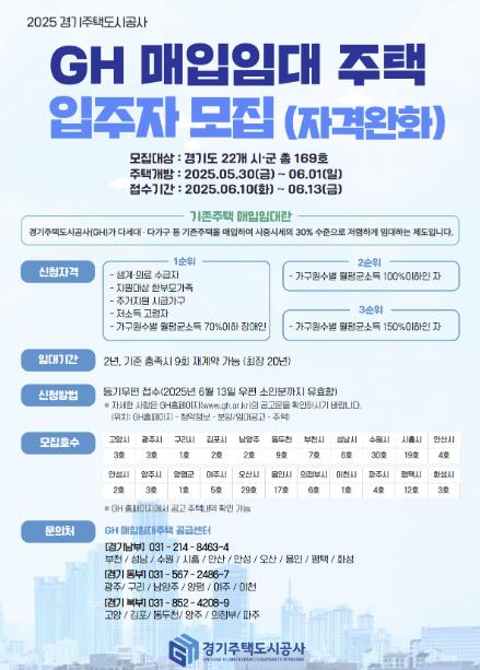 [무한뉴스=정승훈 기자] 경기주택도시공사(GH)는 경기도 내 취약계층의 주거안정을 위해 매입임대주택 입주자를 모집한다고 26일 밝혔다.