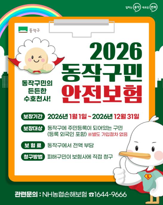 [무한뉴스=정승훈 기자] 동작구는 2026년부터 ‘구민안전보험’을 확대 운영한다고 19일 밝혔다.