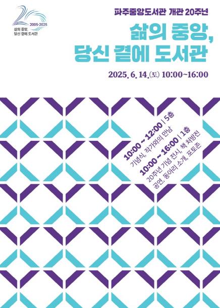 [무한뉴스=정승훈 기자] 파주시 중앙도서관은 개관 20주년을 맞아 도서관의 역사와 지역사회와의 동행을 기념하기 위해 오는 6월 14일 ‘삶의 중앙, 당신 곁에 도서관’ 행사를 개최한다.