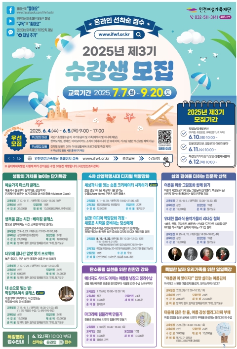 [무한뉴스=정승훈 기자] 인천여성가족재단은 오는 6월 10일부터 2025년도 3기 평생교육프로그램 수강생을 모집한다. [교육 기간 : 2025.7.7 부터 9. 20.]