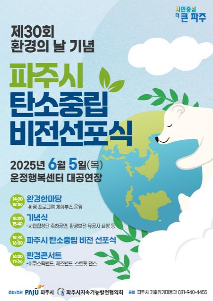 탄소중립 비전선포식은 2050 탄소중립 달성을 위한 파주시의 의지를 표명하고 탄소중립 전환에 대한 시민 공감대를 확산하고자 마련된 자리로, ▲시립합창단 축하공연 ▲환경보전 유공자 표창 ▲기념사 및 축사 ▲탄소중립 비전선포식 순으로 진행된다.