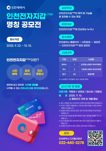 [무한뉴스=정승훈 기자] 인천광역시는 시민들에게 더욱 편리한 디지털 생활을 제공하기 위해 도입하는 블록체인 기반 비대면 공공서비스 앱 ‘인천전자지갑(가칭)’의 명칭 공모전을 9월 22일부터 10월 10일까지 19일간 진행한다고 밝혔다.