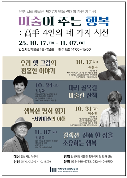 김태익 인천시 시립박물관장은 “명화는 단순히 눈으로 보는 그림이 아니라, 마음으로 느끼는 이야기”라며 “이번 강연을 통해 시민들이 서양미술의 깊은 인문학적 세계를 경험하고, 미술이 전하는 행복의 의미를 새롭게 발견하기를 기대한다”라고 말했다.