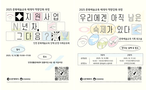[무한뉴스=정승훈 기자] 인천광역시와 (재)인천문화재단은 인천 지역에서 활동하는 문화예술교육 매개자의 전문성 향상과 지속가능한 활동 기반을 위해 '2025 문화예술교육 매개자 역량강화 과정'을 오는 12월 8일부터 17일까지 운영한다.