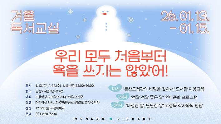 [무한뉴스=정승훈 기자] 파주시 문산도서관은 오는 13일부터 15일까지 사흘간 2026년 문산도서관 겨울독서교실을 운영한다.